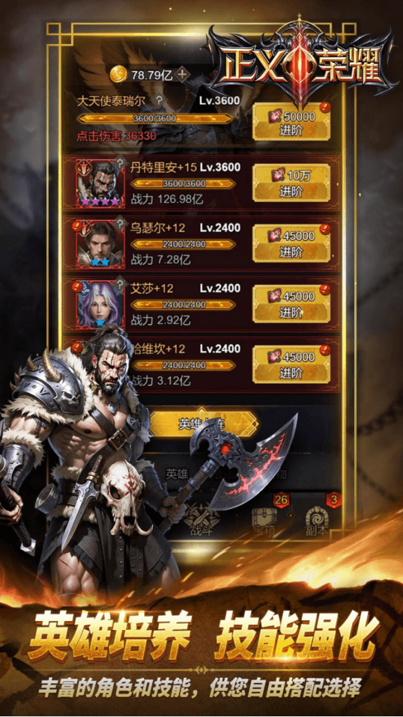 英雄培养,技能强化。丰富的角色和技能,供您自由搭配选择。
